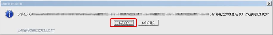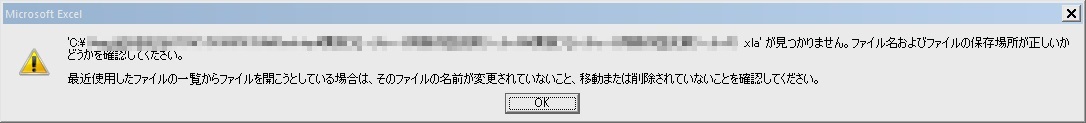 ‘○○○.xla’が見つかりません。ファイル名およびファイルの保存場所が正しいかどうか確認してください。